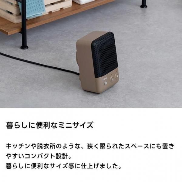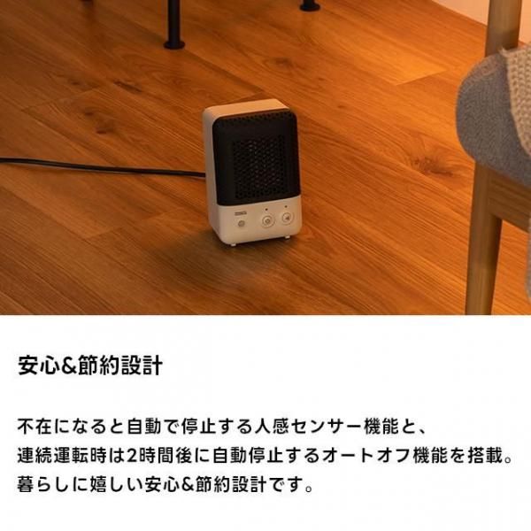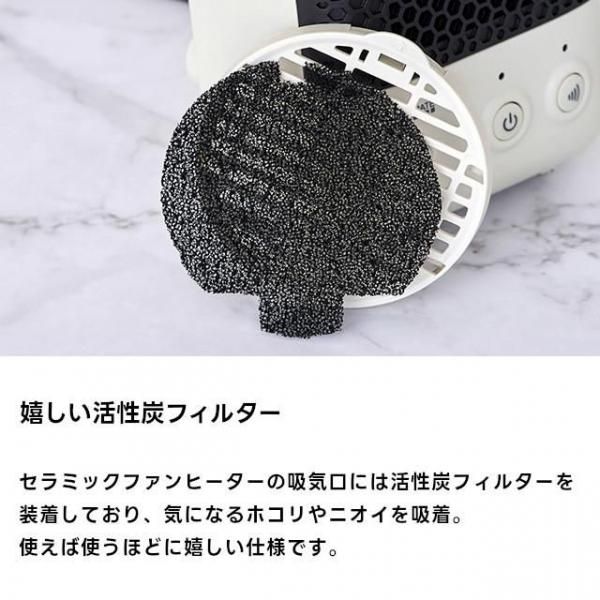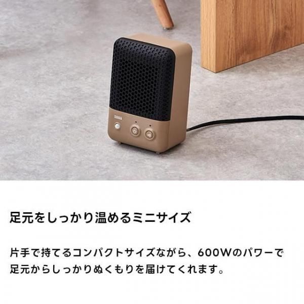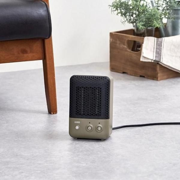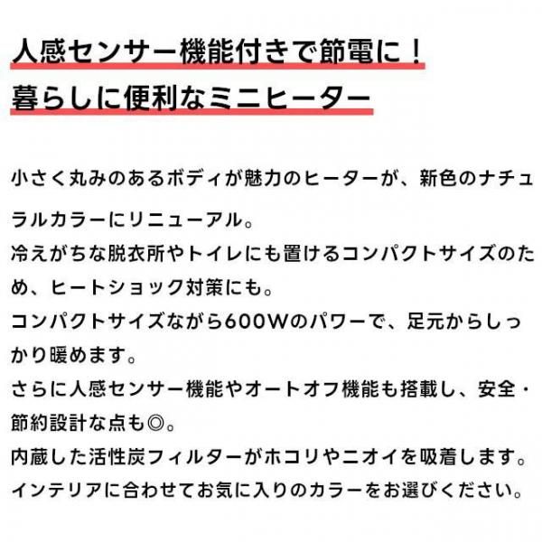人感センサー機能付きで節電に!暮らしに便利なミニヒーター 小さく丸みのあるボディが魅力のヒーターが、新色のナチュラルカラーにリニューアル。 冷えがちな脱衣所やトイレにも置けるコンパクトサイズのため、ヒートショック対策にも。 コンパクトサイズながら600Wのパワーで、足元からしっかり暖めます。 さらに人感センサー機能やオートオフ機能も搭載し、安全・節約設計な点も◎。 内蔵した活性炭フィルターがホコリやニオイを吸着します。 インテリアに合わせてお気に入りのカラーをお選びください。