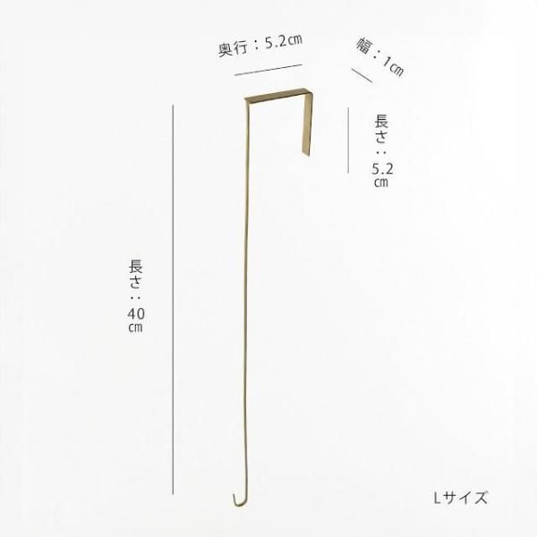 ドアに掛けて使うリースフックです。 ネジなどを打たないので、お家に傷をつけることなく飾っていただけます。 ドアに掛ける部分は真鍮の薄いプレート、フックの部分は棒状の真鍮を職人がたたいて丁寧に作られています。 Lサイズは丸いリースに、Sサイズは縦長のスワッグやお正月のしめ縄飾りにもピッタリです。 室内のドアにも使っていただけるので、バッグや帽子掛けとしても使えます。