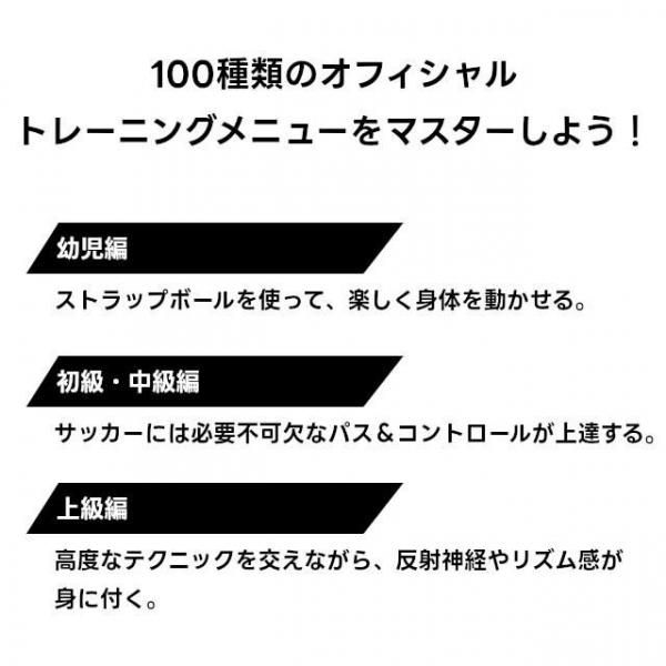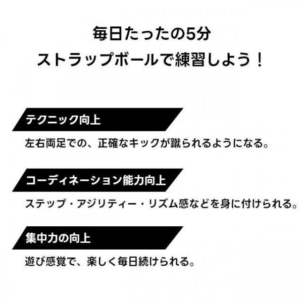 ボールとストラップが一体化して、強化アップ 金具を使っていないので、裸足でも蹴っても安心 毎日たったの5分のトレーニングで上手くなる テクニック向上 -左右両足の正確なキック コーディネーション能力向上 -ステップ、アジリティー、リズム感 集中力の向上 -遊び感覚で楽しく毎日続けられる