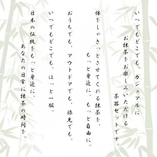 いつでもどこでも、 カジュアルに お抹茶をお楽しみいただける茶器セットです。 体をしゃきっとさせてくれる抹茶を、もっと身近に、もっと自由に。 おうちでも、 アウトドアでも、 旅先でも。 いつでもどこでも、 ほっと一服。 日本の伝統をもっと身近に、 あなたの日常に抹茶の時間を。