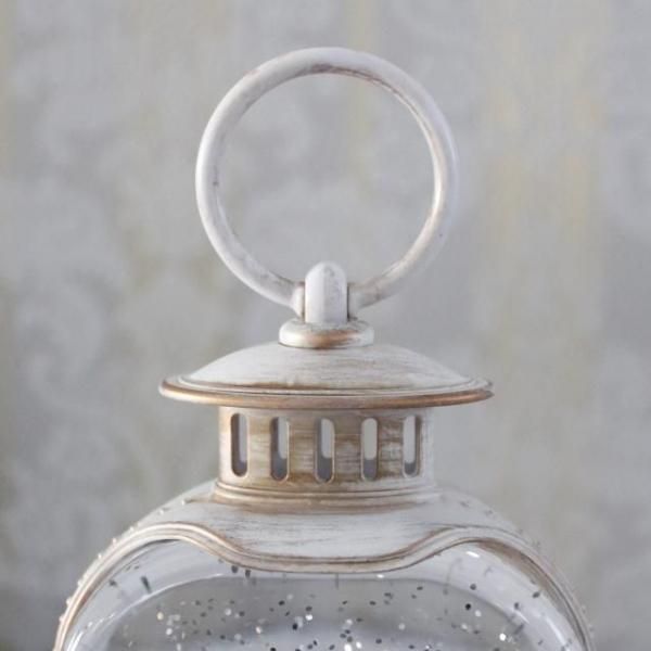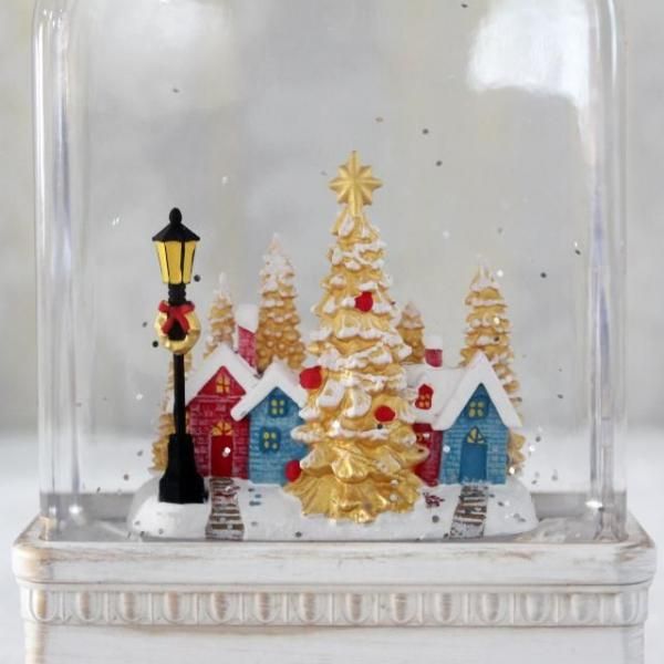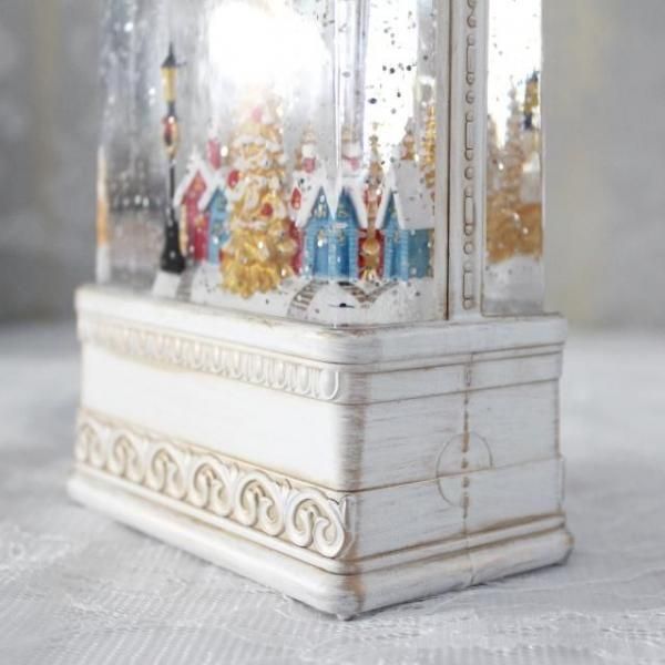 パステルカラーの街並みが入ったクラシカルな白いランタンのオルゴールオブジェ。