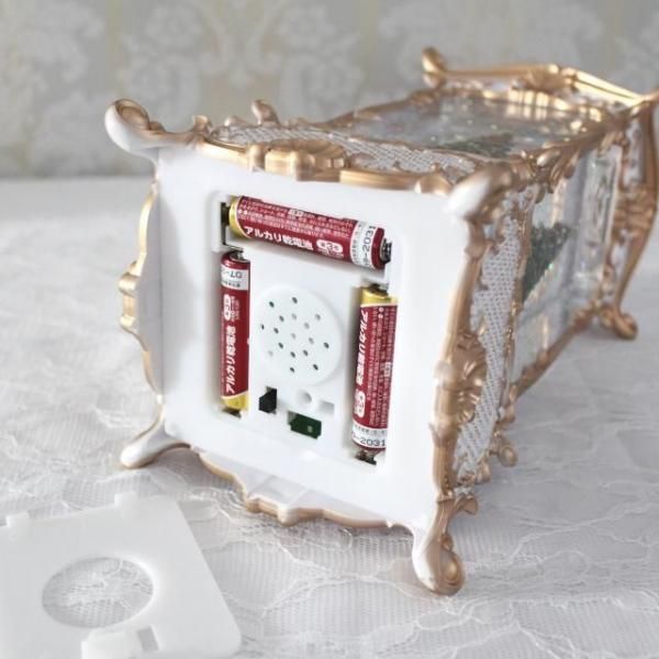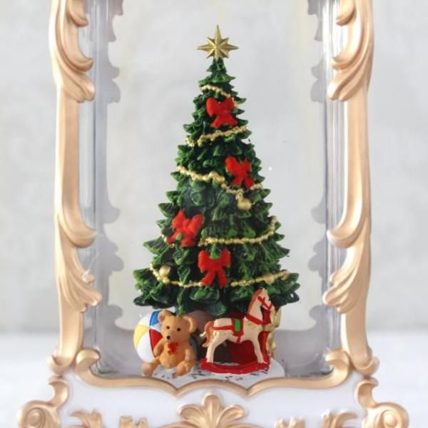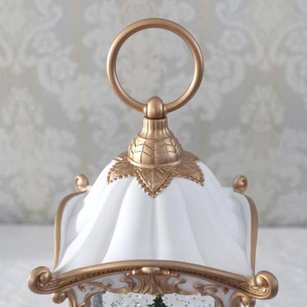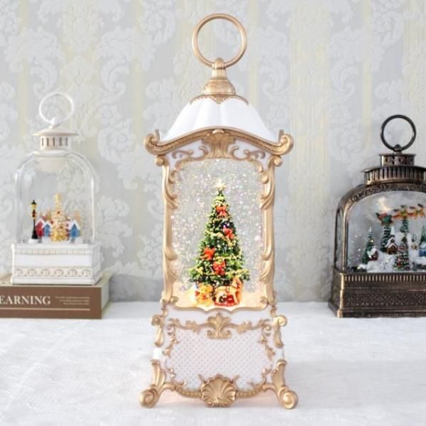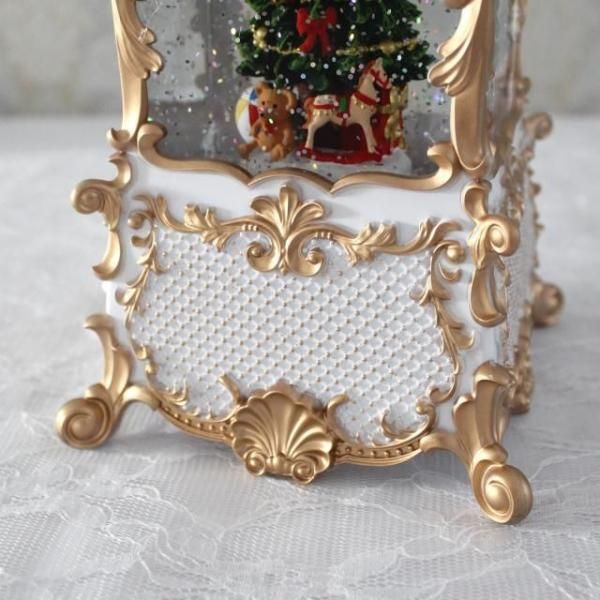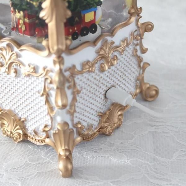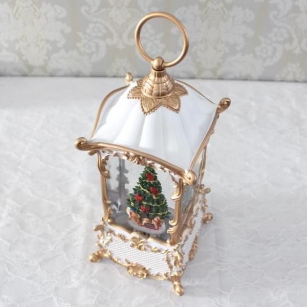 クリスマスツリーが入ったクラシカルなランタンのオルゴール付きオブジェ。 ホワイトとゴールドのカラーリングが華やかでエレガントな印象。 8曲のクリスマスソングがメドレーで流れ、中にはラメが舞い幻想的な雰囲気です。 存在感のあるオブジェで、これ一つでもクリスマス気分を存分に楽しめます。 場所に合わせて電池かUSB接続で使うことができます。