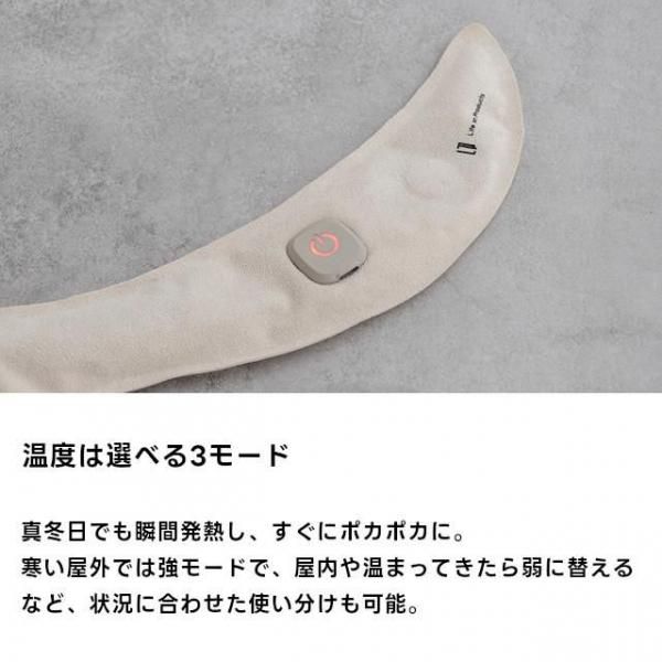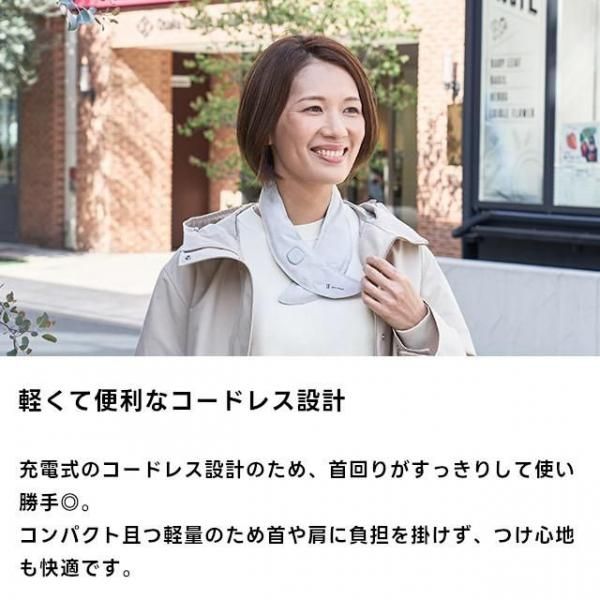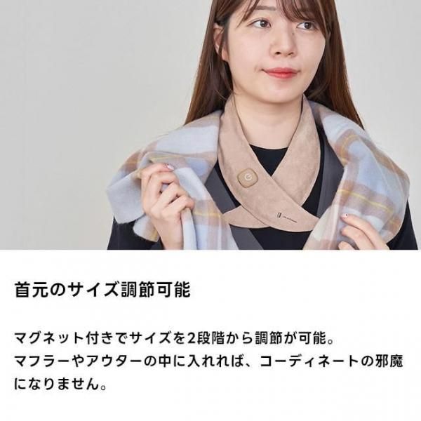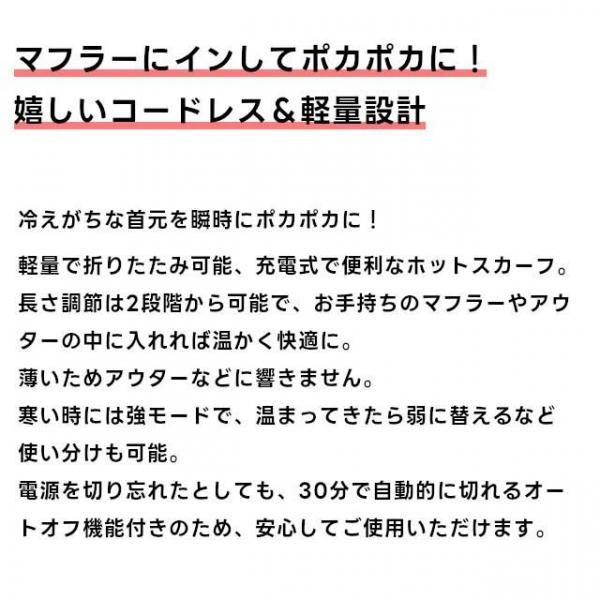 マフラーにインしてポカポカに!嬉しいコードレス&軽量設計 冷えがちな首元を瞬時にポカポカに!軽量で折りたたみ可能、充電式で便利なホットスカーフ。 長さ調節は2段階から可能で、お手持ちのマフラーやアウターの中に入れれば温かく快適に。 薄いためアウターなどに響きません。 寒い時には強モードで、温まってきたら弱に替えるなど使い分けも可能。 電源を切り忘れたとしても、30分で自動的に切れるオートオフ機能付きのため、安心してご使用いただけます。