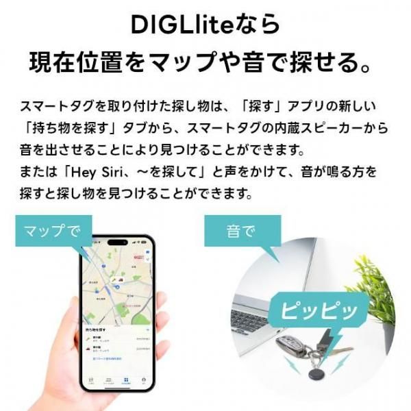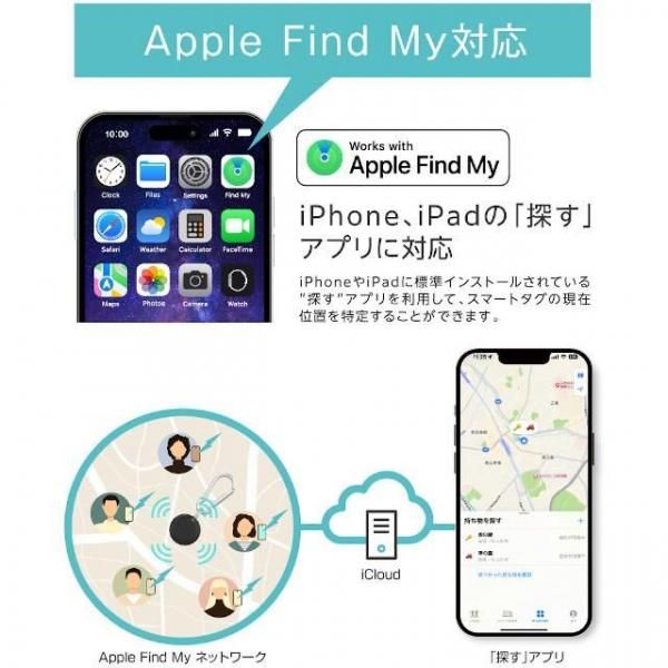 iPhoneの「探す」アプリでタグの現在位置をマップや音で探せるスマートタグです。
